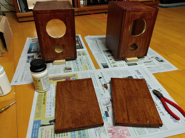 대략 이번 나왕으로 만들고 나서 4"짜리 TQWT를 만들어 아들 줄려고 하는데 나왕합판도 그리 휨이 좋지 않은것 같다. 사이즈가 작아서 그냥 맞췄는데 70cm 정도 되면 휨으로 인한 오차가 샐길것 같다.