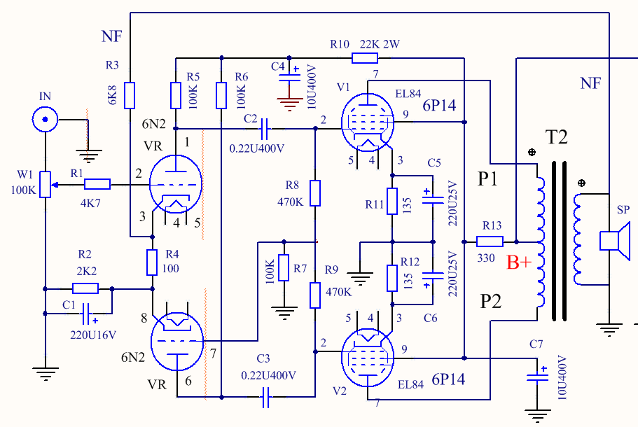 6N2P-6P14 pp amp 예전 6BQ5 PP를 만든적이 있는데 싱글대비 크게 좋다는 기억이 없었다. 잊고있던차에 알리에 진공관까지 포함해서 40$정도의 kit 팔길래 낼름 구매하였고 66코어 출력 트랜스도 싼게 있어서 같이 구매하였다. Dynaco 6BQ5pp 회로라는데 PCB가 오면 들여다 봐야 겠다. 회로를 들여다보면 출력단쪽에 뭔가 이상한 느낌이다. 캐소드저항이 135옴이라... 계산상으로는 플레이트에 270V 정도 인가될때 전류가 근 60mA 가 흐를 조건이고 max plate dssipation 12W도 넘어선다. 계산상으로 플레이트 270V일떄 36mA, 캐소드 저항은 270옴, 캐소드전압은 9.67V정도 일것 같다. 입수된 PCB상의 부품을 몇개 변경해야 겠다. 출력관 캐소드저항과 캡, 초단 캐소드 캡, 기타 캡들이.. Audio/Tube PP Power AMP 2022.04.20