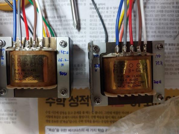 출력 트랜스 중국산 출력 트랜스를 구입해보았다. 66코아로 5K 싱글용과 10K pp용을 각각 구입하였다. ■ 10KPP 출력 트랜스 P1(파)-G1(회)-B+(빨)-G2(갈)-P2(흰) 16옴(녹)-8옴(주황)-4옴(노)-0(검) ■ 5K SE 출력 트랜스 8옴(주황)-4옴(노)-0(검) B+(빨)-G(회)-P(파) Audio/악세사리 2022.07.02
