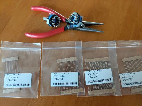 파워 amp용 볼륨 파워 amp용으로 사용하기위한 간단한 attenuator를 만들었다. 6단 2회로 로터리 스위치를 이용해서 만들었고 땜질을 쉽게하기위해서 1/8W짜리로 했다. 단수가 6개니 필요한 저항은 5개가 되겠다. 엑셀로 대충 log 삘이 나도록 했다. 구입한 저항은 1/8W 10K, 14K, 20K, 47K 4가지 종류로 10K, 10K, 14K, 20K, 47K순으로 땜질을 했고 실질적으로 0, 10K, 20K, 34K, 54K, 100K가 된다. 최근에 만든 MOSFET amp에 적용할것이다. Audio/Audio 개인 2022.04.17